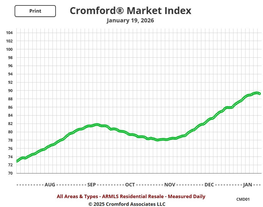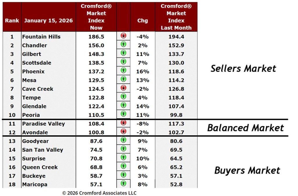 - The Cromford Market Index — a widely followed measure of how balanced things are between buyers and sellers in Phoenix — is at its strongest in roughly 12 months and just a few ticks away from a neutral market